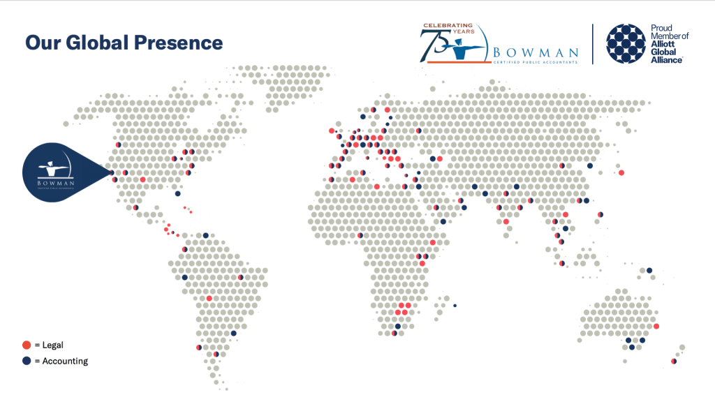 As the global business environment has grown more connected, we have found it critical to our success to align with like-minded professionals throughout the world. For over 10 years Bowman has been a proud member of the Alliott Global Alliance, an alliance of 235 independent accounting, legal, and specialty advisory firms, working in over 100 countries across the world.